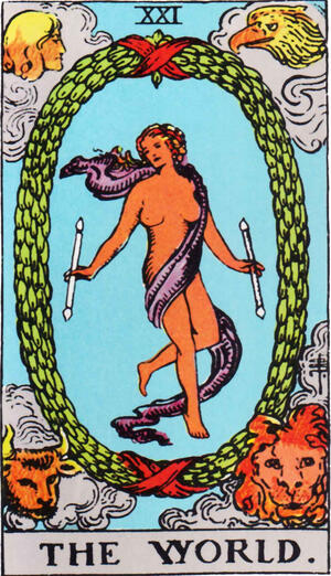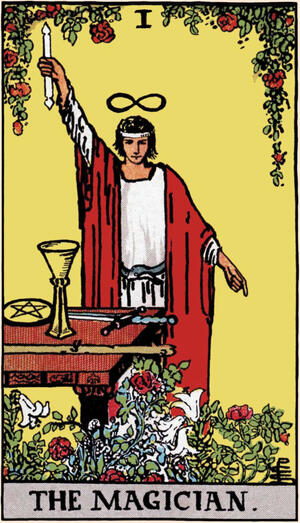 ผู้วิเศษกำลังยืนอยู่โดยมีแขนข้างหนึ่งชี้ขึ้นไปยังจักรวาลและอีกข้างหนึ่งลงสู่พื้นโลก ซึ่งแสดงถึงความเชื่อมโยงพลังความเป็นจริงและจิตวิญญาณ คทาสีขาวแสดงถึงความบริสุทธิ์และเสื้อคลุมสีแดงของเขาแสดงถึงความรู้และประสบการณ์