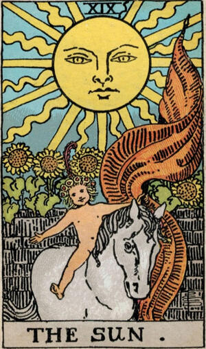 ดวงอาทิตย์ขนาดใหญ่ที่ส่องสว่างบนท้องฟ้า แสดงถึงแหล่งกำเนิดของสิ่งมีชีวิตทั้งหมดบนโลก ในเบื้องหน้ามีเด็กเปลือยกายนั่งอยู่บนม้าขาวเป็นสัญลักษณ์ของความบริสุทธิ์และความแข็งแกร่ง ในขณะที่เด็กเป็นสัญลักษณ์ของความสุขที่ได้เชื่อมโยงกับวิญญาณภายในของคุณเป็นตัวแทนของความไร้เดียงสา