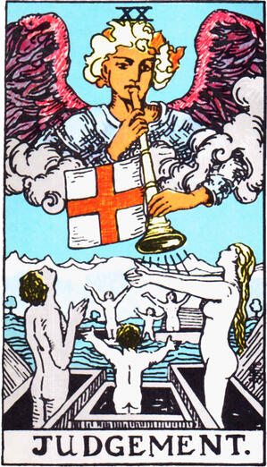 ไผ่ใบนี้แสดงวันพิพากษา เมื่อคนตายจะลุกขึ้นเพื่อตอบการเรียกของทรัมเป็ตของกาเบรียล และพร้อมที่จะได้รับการประเมินการกระทำของพวกเขาในชีวิตและได้รับมอบหมายให้ดำรงอยู่ชั่วนิรันดร์ ด้านหลังเป็นเทือกเขาที่กว้างขวางแสดงถึงความเป็นไปไม่ได้ที่จะหลีกเลี่ยงการตัดสิน