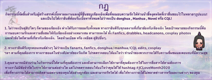 มาค่ะ! พวกเราตื่นเต้นที่จะได้ประกาศเรื่องการใช้แท็กกิจกรรม #JCLoveMonth2020 ที่กำลังจะมาในไม่ช้าของช่วงเดือนพฤศจิกายน ว่าด้วยเรื่องกฏและธีมต่างๆของกิจกรรมก็จะประกาศอีกครั้งในเร็วๆนี้ ซึ่งแน่นอนค่ะว่ากิจกรรมนี้อิสระเรื่องเรือของเจียงเฉิงและคู่เกี่ยวกับเจียงเฉิงทั้งหมด!