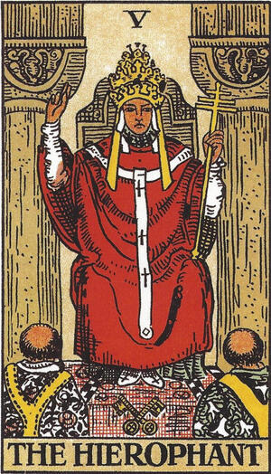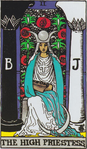 นักบวชหญิงนั่งอยู่ข้างหน้าม่าน เป็นสัญลักษณ์ของจิตใจที่ถูกแยกออกจากจิตสำนึกและจิตไร้สำนึกที่มองเห็นและไม่เห็น เสาทั้งสองต้นที่เธอนั่งอยู่นั้นเป็นตัวแทนของความแข็งแกร่งและการตั้งตัวและยังเป็นสัญลักษณ์ความเป็นคู่โดยธรรมชาติ
