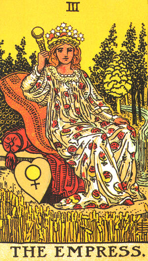 จักรพรรดินีนั่งอยู่บนบัลลังก์ที่ล้อมรอบไปด้วยธรรมชาติที่อุดมสมบูรณ์แสดงถึงการเชื่อมโยงของเธอและพื้นโลกและอาจหมายถึงคนที่มีความเป็นแม่ ผู้ให้กำเนิดดูแลลูกอย่างดีก็เป็นได้และเธอจะนำพาความอุดมสมบูรณ์และพรมาให้