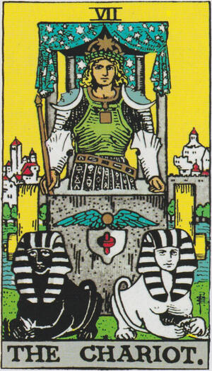 ราชรถที่มีนักรบยืนอยู่ในรถม้าที่ถูกตรึงโดยสฟิงซ์ซึ่งถูกดึงไปทิศทางที่ตรงกันข้ามเป็นสัญลักษณ์ความเป็นคู่ แต่ผู้ควบคุมรถม้าได้ควบคุมพวกเขาด้วยพละกำลังที่เขาสามารถทำได้ มงกุฎของเขาเป็นสัญลักษณ์ของชัยชนะความสำเร็จและการตรัสรู้ทางวิญญาณ