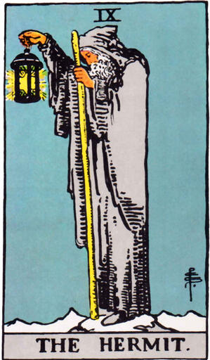 ชายชราคนหนึ่งยืนบนยอดเขาถือไม้เท้าและตะเกียง ภูเขาหมายถึงความสำเร็จและการค้นพบตัวเอง ตะเกียงเป็นสัญลักษณ์ของภูมิปัญญาและก้าวไปข้างหน้า