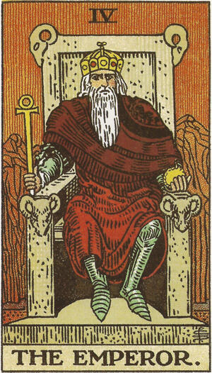 จักรพรรดินั่งบนบัลลังก์ที่ประดับด้วยหัวแกะสี่หัวแสดงถึงราศีเมษและดาวอังคาร เขาถืออังค์และวัตถุทรงกลมและกำลังเฝ้าดูแลอาณาจักรของเขา ข้างหลังของเขาเป็นภูเขาแห้งแล้งแสดงถึงรากฐานที่แข็งแกร่งแต่ไม่สามารถทนต่อการเปลี่ยนแปลงได้