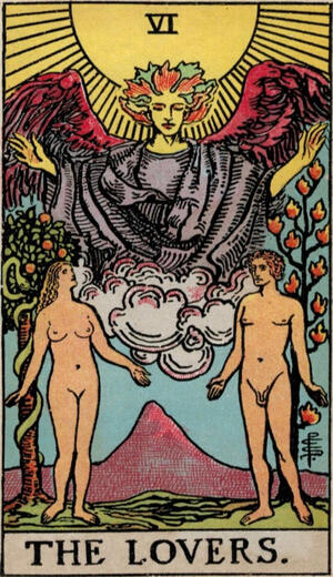 คู่รักชายและหญิงที่เปลือยกายในสถานที่คล้ายสวนอีเดนที่ได้รับจากพระเจ้าราฟาเอล ด้านหลังของผู้หญิงมีต้นไม้ที่มีงูอยู่ตามกิ่งแสดงถึงการล่อลวงและความหลงใหล