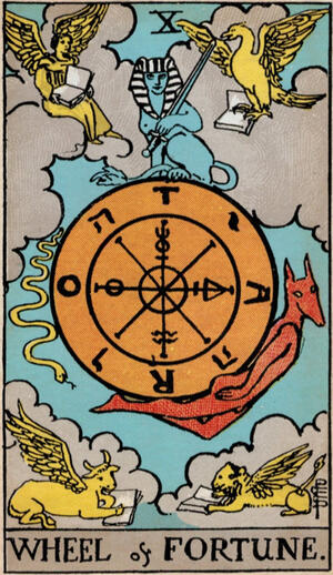วงล้อยักษ์ที่ล้อมรอบไปด้วยเทพเจ้าอียิปต์อะนูบิส เทพเจ้าแห่งความตายเซท เทพเจ้าแห่งความโกลาหลและสฟิงซ์ซึ่งเป็นตัวแทนของความรู้และสติปัญญา ในมุมไพ่จะเห็นสิ่งมีชีวิตมีปีก4ตัวสอดคล้องกับพวกกลุ่มราศีกุมภ์ ราศีพฤษภ ราศีพิจิก และราศีสิงห์