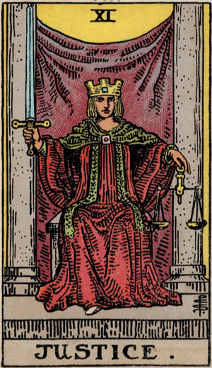 ไพ่ยุติธรรมเป็นภาพที่มีเสาสองต้นเป็นสัญลักษณ์ของความสมดุลกฎหมายและโครงสร้าง ในมือซ้ายของเธอถือตาชั่งเพื่อแสดงความสมดุลของตรรกะและความยุติธรรมที่เป็นกลาง ในด้านขวาของเธอถือดาบชี้ขึ้นแสดงความมั่นคงและการตัดสินใจขั้นสุดท้ายและดาบสองคมหมายถึงการกระทำของเราที่มีผลตามมา