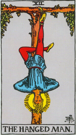 ชายแขวนคอถูกแสดงให้เห็นว่าเท้าของเขาห้อยลงมาจากต้นไม้โลก เขาเป็นคนเงียบสงบและเงียบสงบ เขากำลังแขวนคออยู่กับความตั้งใจของตัวเอง เขาเห็นโลกจากมุมมองที่แตกต่างอย่างสิ้นเชิง เขาสวมกางเกงสีแดงเป็นสัญลักษณ์ของความรักของมนุษย์และร่างกายและเสื้อกั๊กสีฟ้าเพื่อความสงบและความรู้ ไพ่นี้ถือเป็นการพรรณนาถึงการยอมแพ้ขั้นสุดท้ายและการเสียสละ