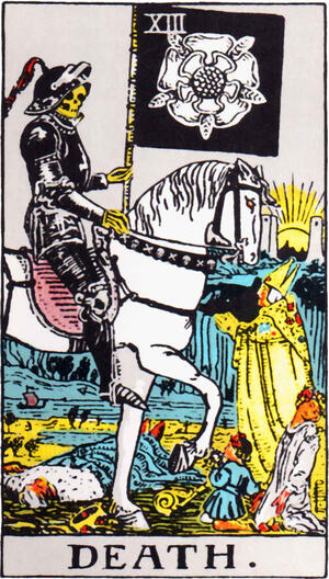 ความตายเป็นภาพเหมือนโครงกระดูกบนอาชาสีขาว ซึ่งแสดงถึงความบริสุทธิ์ เขาสวมชุดเกราะสีดำเป็นสัญลักษณ์ของการอยู่ยงคงกระพัน ยมทูตผู้มอบความตายแก่ทุกคนไม่เว้นแม้แต่จักรพรรดิ ได้เดินทางมาเพื่อจะมอบความตายให้แม่และเด็ก แต่ทว่าพระสังฆราชได้มาเจรจาให้หยุดยั้งไว้