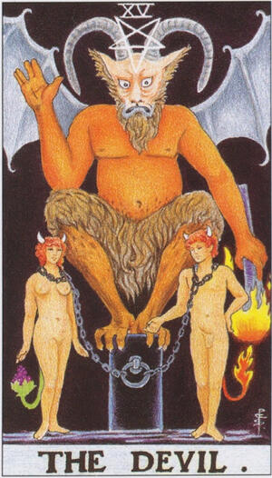 ปีศาจที่ตกแต่งด้วยปีกค้างคาวแทนความปรารถนาดิบ เหนือเขาจะแสดงรูปดาวห้าแฉกคว่ำสัญลักษณ์ของด้านมืดของไสยเวท ชายและหญิงมาผูกมัดกันด้วยโซ่ แต่ทว่าโซ่ที่มัดหลวมนี้อันที่จริงไม่ได้ผูกมัดทั้งสองคนไว้ แต่เป็นสิ่งที่อยู่ลึกลงไปในจิตใจที่ทำให้คนสองคนยังผูกติดกันอยู่ พวกเขามักจะแสดงด้วยองุ่นและเปลวไฟบนหางของพวกเขาเป็นสัญลักษณ์ของการเสพติดเพื่อความสุขในพลังงานและความต้องการทางเพศ