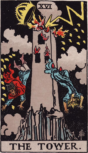 หอคอยที่มียอดแหลมอยู่บนภูเขาที่ถูกฟ้าผ่า มีเปลวไฟจนผู้คนต่างก็กระโดดเพื่อความปลอดภัย หอคอยเป็นตัวแทนของความทะเยอทะยานที่สร้างขึ้นบนหินที่พังทลายไปในครั้งแรกที่ได้รับแรงฟ้าผ่า สายฟ้าเป็นสัญลักษณ์ของความก้าวหน้าและแรงบันดาลใจ คนแก่จะต้องถูกทำลายเพื่อหลีกทางให้คนรุ่นใหม่