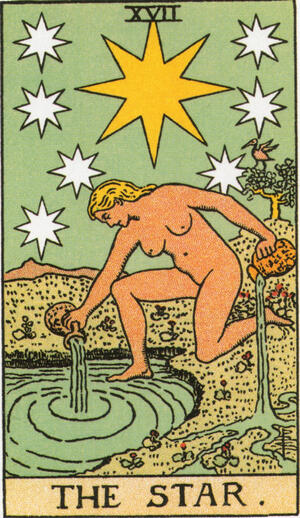 เดอะสตาร์ได้รับบทเป็นผู้หญิงคุกเข่าที่สระน้ำขนาดเล็ก เธอเทน้ำออกเพื่อบำรุงดินและดำเนินต่อไปตามวัฏจักรแห่งความอุดมสมบูรณ์ ผู้หญิงคนนี้มีเท้าข้างหนึ่งอยู่บนพื้นแสดงให้เห็นการปฏิบัติจริงและสามัญสำนึกของเธอและคนอื่น ๆ ในน้ำแสดงสัญชาตญาณและทรัพยากรภายใน
