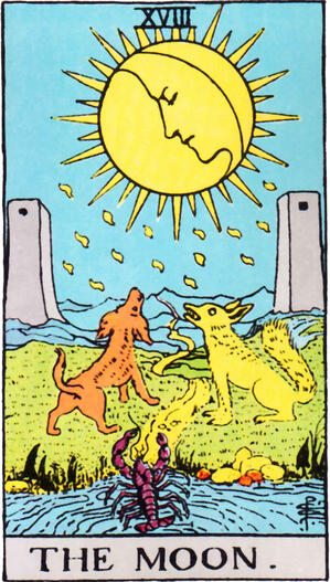 เดอะมูนแสดงให้เห็นถึงพระจันทร์เต็มดวงในท้องฟ้าส่องสว่างเส้นทางที่ทอดยาวไปสู่ทางที่ห่างไกลและระหว่างทางมีหอคอยทั้งสองซึ่งเป็นตัวแทนของความดีและความชั่ว ในเบื้องหน้าหมาป่าและสุนัขนั่งทั้งสองข้างทาง และหอนไปยังดวงจันทร์ ไผ่นี้แสดงถึงความแตกต่างแคบ ระหว่างจิตใจที่มีสติและไม่รู้สึกตัว ด้านที่มีอารยะและธรรมชาติของมนุษย์ ความดีและความชั่วที่คล้ายคลึงกันจนมองไม่ออก